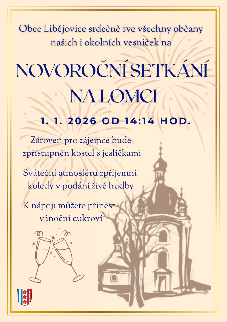 Obec Libějovice srdečně zve všechny občany na novoroční setkání na Lomci, které se koná 1. ledna 2026 od 14:14 hodin. Tato událost je určena pro všechny obyvatele obce a okolních vesniček. Zároveň bude zpřístupněn kostel s jesličkami. Sváteční atmosféru umocní koledy v podání živé hudby, které přispějí k příjemnému prožití tohoto setkání.