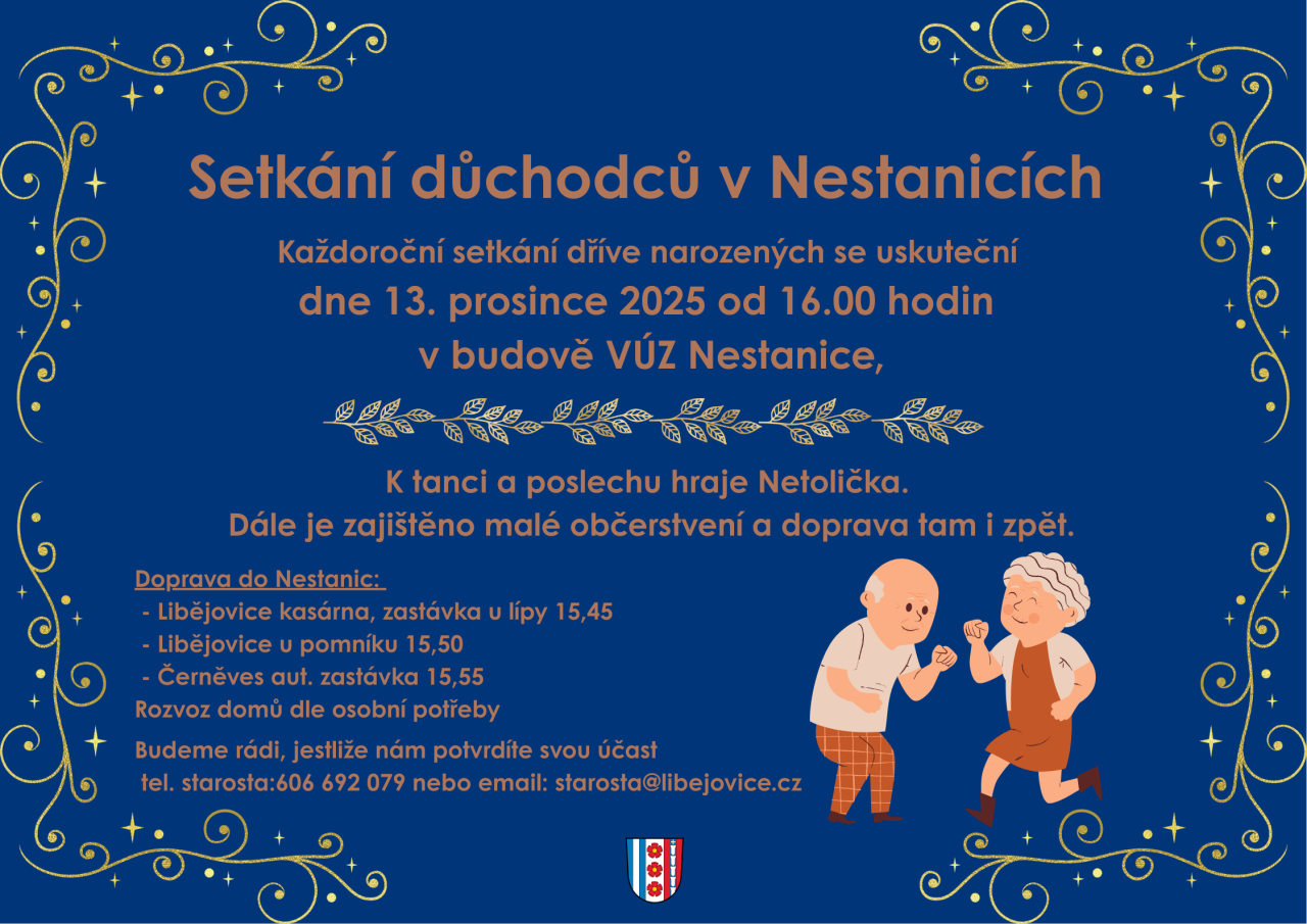 Zveme všechny dříve narozené na každoroční setkání, které se koná 13. prosince 2025 od 16:00 v budově VÚZ Nestanice. K tanci a poslechu zahraje skupina Netolička. Zajištěno bude také malé občerstvení a doprava do Nestanic a zpět. Odjezd z Libějovic a Černěvsi je naplánován na 15:45, 15:50 a 15:55. Potvrzení účasti je možné telefonicky nebo e-mailem.